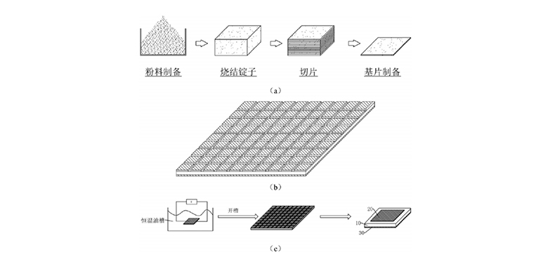 根據材料配方將各種金屬氧化物(錳、鈷、鐵、鎳、銅、鋅)按照相應比例配制得混合物料;然后將物料倒入模具中,初步手壓成型后,在超高壓下繼續成型,得到錠子;將錠子加入預先鋪好氧化鋁砂的氧化鋁缽內,然后用氧化鋁砂填埋錠子后進行燒結,得到燒結好的錠子;將錠子固定于內圓切割機專用夾具上,調整參數進行切割,然后用純水超聲清洗干凈后烘干,得到熱敏基片。