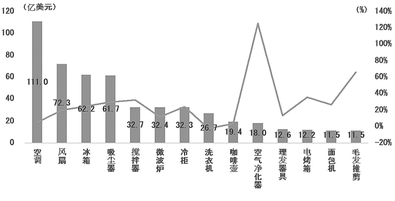 2020 年1~12月小家電及零件出口533.9億美元,較上年同比增長26.1%。與居家抗疫相關度高的攪拌榨汁類產品,電炒鍋、電烤箱及面包機等廚房小家電,以及電推剪產品需求明顯增多,從第二季度開始持續增長。其中攪拌器和榨汁機出口量較上年同期分別增長29.6%和24.5%;微波爐、電炒鍋、電烤箱及面包機出口量較上年同期分別增長12.7%、24.7%、28.2%和17.2%;電推剪出口量較上年同期增長37.1%。空氣凈化器、加濕器等產品近年來本就處在上升期,再受到疫情居家因素拉動,出口大幅增長,空氣凈化器、加濕器、干洗機、洗碗機分別較上年同期增長74.7%、36.9%、32.8%和28.8%。