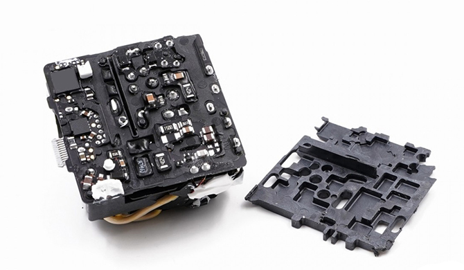 大部分充電器插頭的內部是全黑氧化物印刷電路板和黑色電子元器件,印刷電路板的后面是塑膠保障框架,作為固定架。充電器插頭頂部的電感,電容和變壓器也裝有相應的塑膠骨架實現固定。在印刷電路板上,是電源主控制集成電路,NTC熱敏電阻和別的電子元器件。