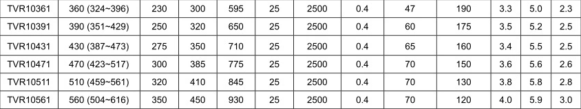 沖擊電流: 2500 額定功率: 0.6 工作溫度范圍: -40℃-+85℃ 儲存溫度范圍: -40℃-+125℃ 連續工作電壓Vac(mns): 300 連續工作電壓Vdc: 385 ![]()